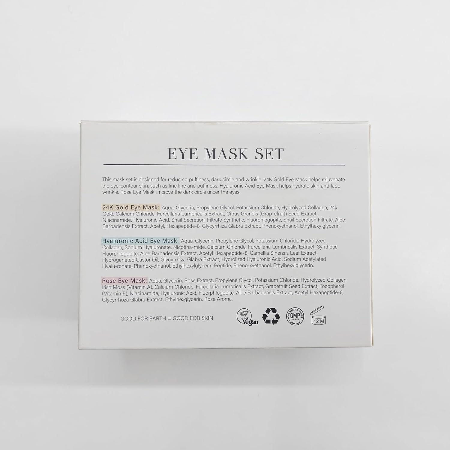 Independent Packaging: This product contains 10 pairs of rose eye mask, 10 pairs of hyaluronic acid eye mask, and 10 pairs of 24K gold eye mask. 24K Gold Eye Mask helps rejuvenate the eye-contour skin, such as fine line and puffiness. Hyaluronic Acid Eye Mask helps hydrate skin and fade wrinkle. Rose Eye Mask helpsto remove dark circle.Each pair of eye mask is independent packaging to ensure that it will not be contaminated