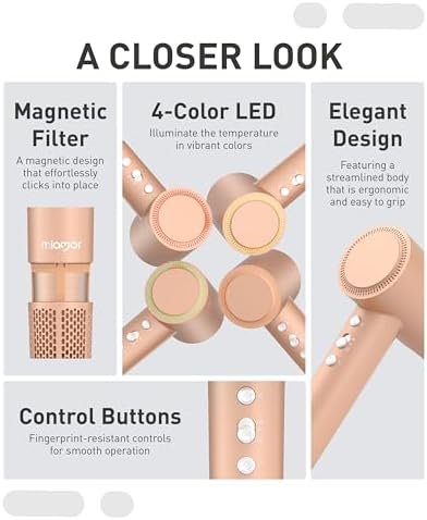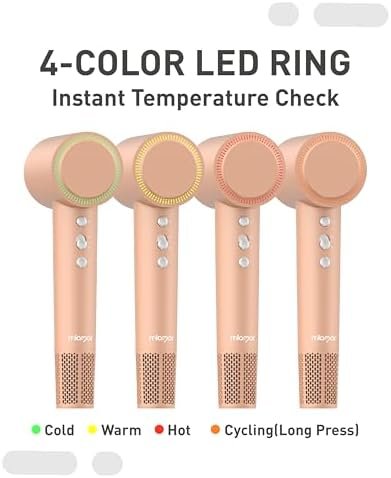 4 Color LED Ring: The 4-color LED ring provides visual cues for temperature settings: red for 176.0°F hot air, orange for 122.0°F warm air, green for cold air, and yellow for alternating hot and warm air. Experience precise temperature control with minimal noise for an enhanced drying experience.