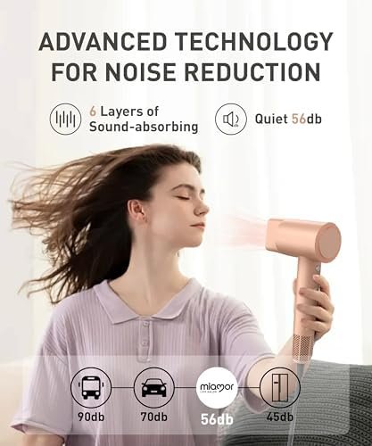 Quiet Operation with Low Noise Level: Enjoy a peaceful drying experience with our low-noise brushless hair dryer, operating at just 56 dB. Perfect for early mornings or late nights, it won’t disturb your household or your own relaxation time.