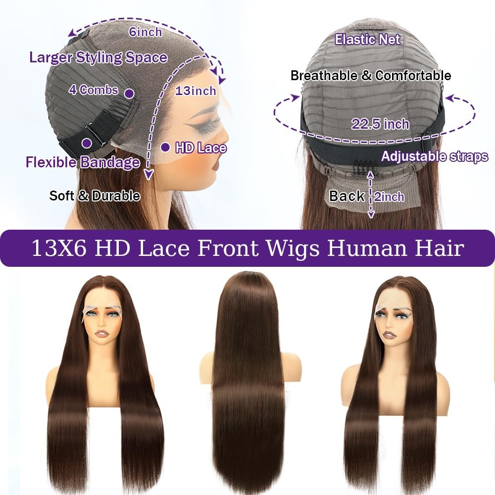【Chocolate Brown Lace Front Wig Material】100% Unprocessed 10A Grade Brazilian Virgin Human Hair Straight Lace Front Wigs Human Hair, 200% Density HD Lace Front Wigs Human Hair, Cut From Healthy Young Female Head Directly. Natural And Healthy, Full And Healthy End, Soft And Comfortable Against Skin.