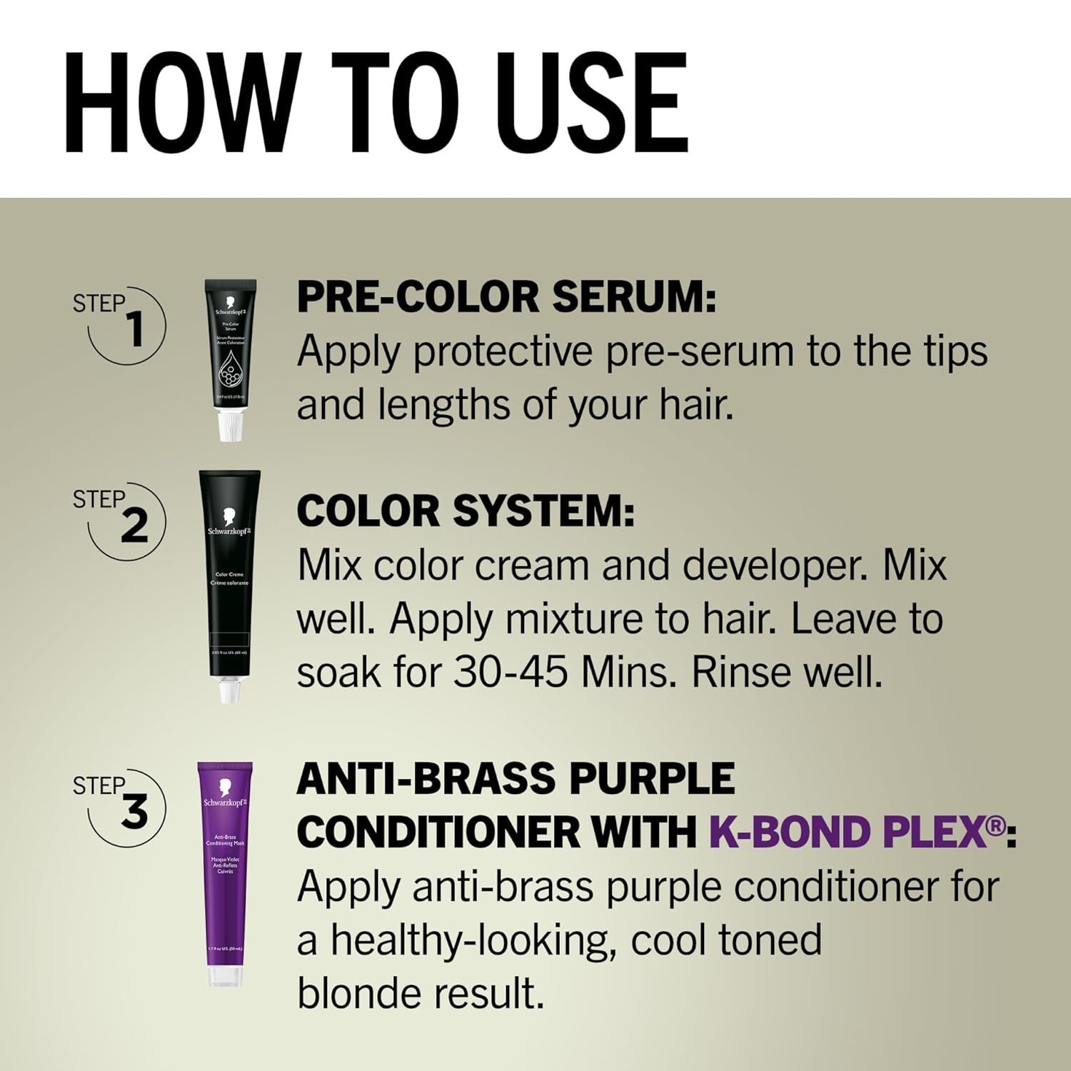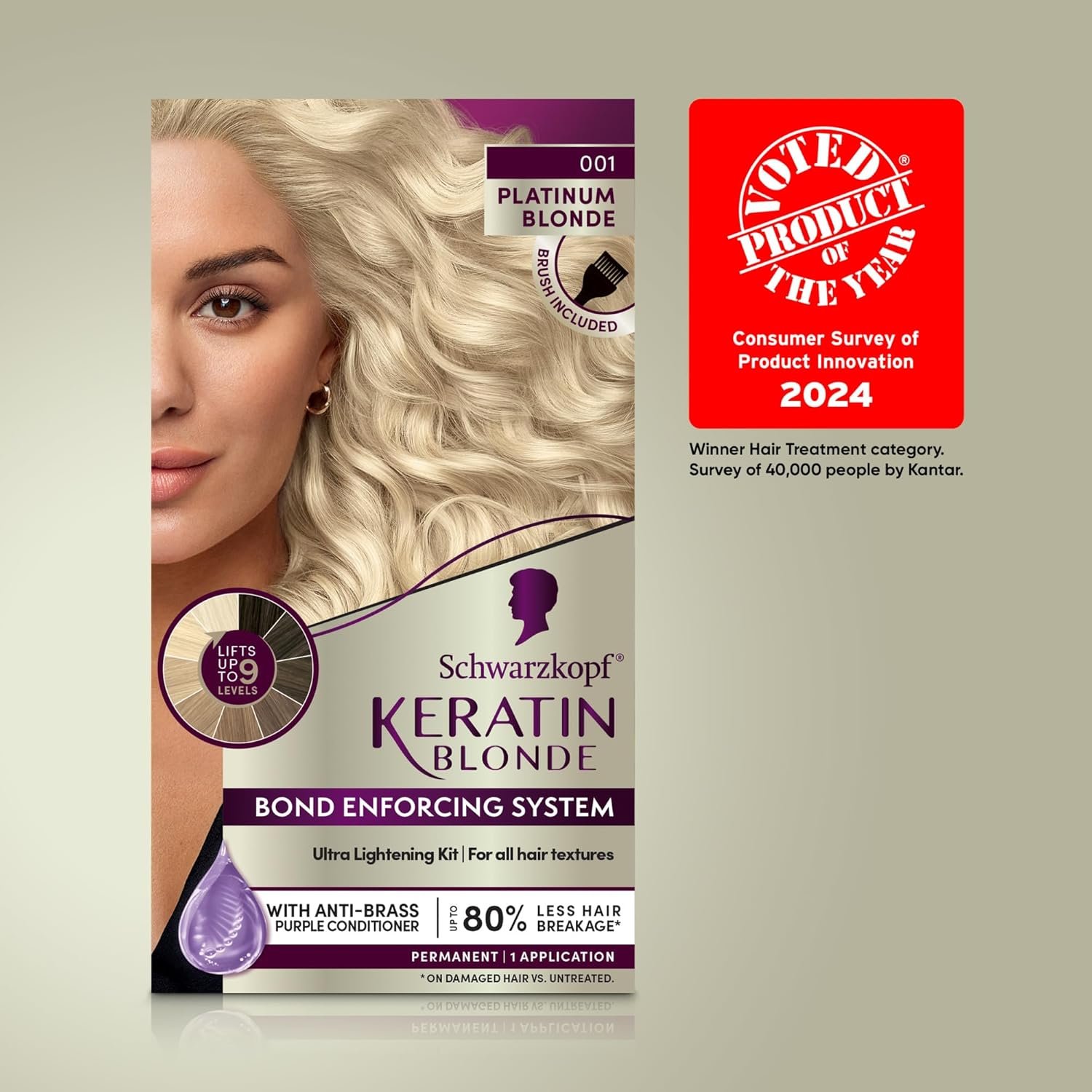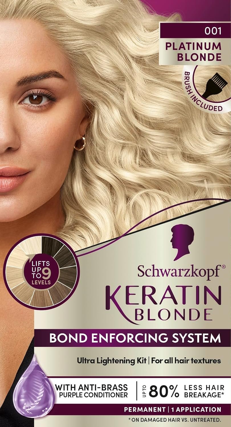 Schwarzkopf Keratin Blonde Hair Dye Platinum Blonde 001, Ultra Lightening Kit – Professional Quality Blonde Formula . This hair dye provides rich, striking color on all hair textures – while reducing hair damage*. The Keratin hair color formula was developed with professionals to provide professional quality hair color lightening and brilliant shine. Our 3-step Bond Enforcing System creates bonds and strengthens your hair*. In addition, this platinum blonde hair color for women provides up to 9 levels of lift while reducing hair damage**. The pre lightening serum conditions hair before lightening for even color results. The 2-in-1 purple repair mask neutralizes brassy & yellow undertones. Established in 1898, Schwarzkopf has 125+ years of hair expertise, providing professional quality color at home. The product benefits at a glance: 3-step Bond Enforcing System strengthens your hair*. 9 levels of lift with less damage**. Pre-color serum with vitamin B6 and collagen. Suitable for all hair textures: curly, kinky, coily, textured hair. Maintains curl pattern. Neutralize brassy & yellow undertones. Color: Platinum Blonde 001. *Against combing breakage on damaged hair vs. untreated. **On damaged straight hair vs. untreated.