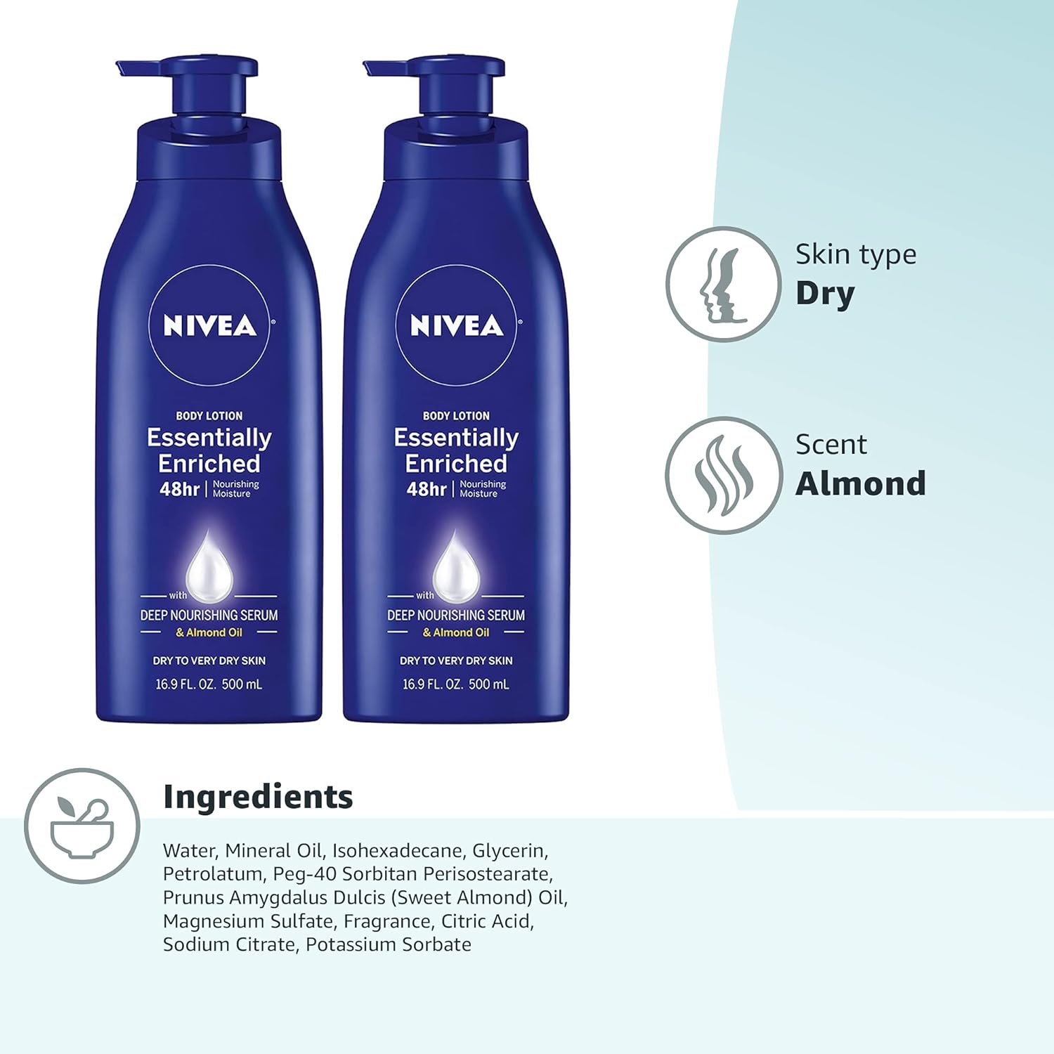 Includes two (2) 16.9 fluid ounce pump bottle of NIVEA Essentially Enriched Body Lotion