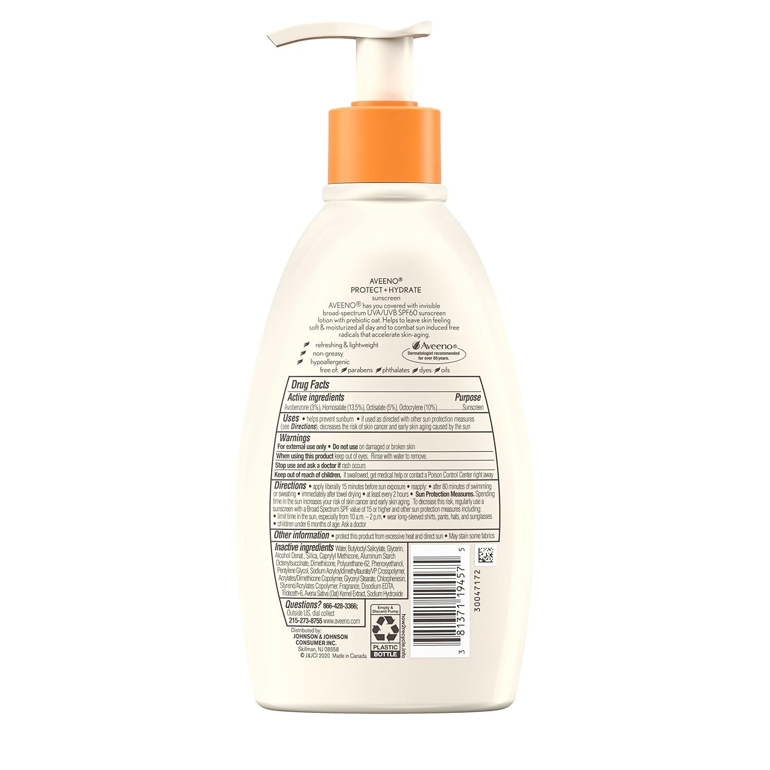 Moisturize & protect your skin from the sun with Aveeno Protect + Hydrate Body Sunscreen Lotion. From Aveeno, a dermatologist-recommended brand for over 70 years, this weightless oil free sunscreen lotion contains SPF 60 to protect from harmful UVA/UVB rays. Made with nourishing prebiotic oat, the daily moisturizing sunscreen hydrates skin all day, leaving it feeling soft & smooth. When used as directed with other sun protection measures, helps prevent sunburn and, if used as directed with other sun protection measures, decreases the risk of skin cancer and early skin aging caused by the sun. The non-greasy, formula dries clear. This sunscreen for sensitive skin is paraben, phthalate, oil, oxybenzone and dye free. Water and sweat-resistant for up to 80 minutes, the moisturizing SPF 60 sunscreen lotion is perfect for outdoor activities. For best results, apply the sunscreen 15 minutes before sun exposure and reapply every two hours or more often as directed for sun protection.